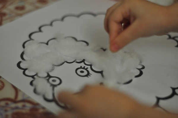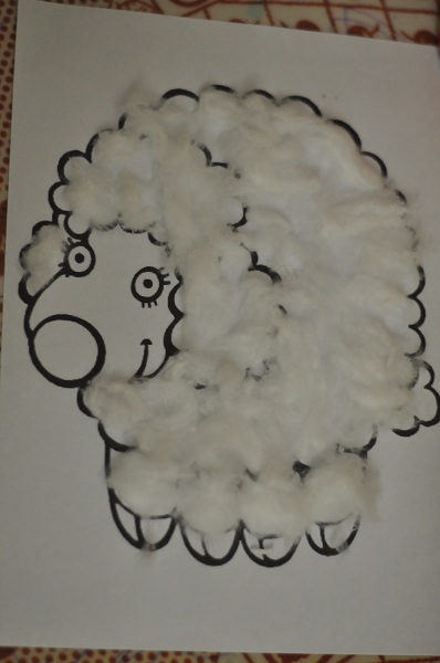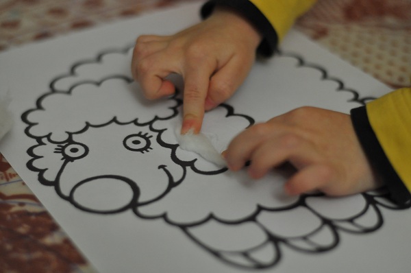 Понадобится: лист с напечатанным/нарисованным барашком, клей-карандаш, вата