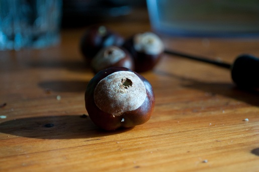 Для начала надо продырявить каштаны. Можно это сделать шилом. Я делала дырки простой отверткой, каштаны достаточно мягкие.
