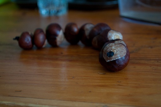 Можно подобрать все каштаны одного размера, а можно нанизывать сначала большие, а потом маленькие, чтобы у гусенички получился более тонкий хвост и большая голова.