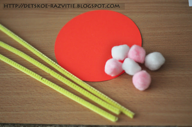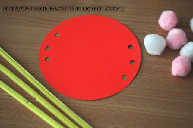 Понадобится: цветной картон, пушистая проволока, помпоны, клей, дырокол