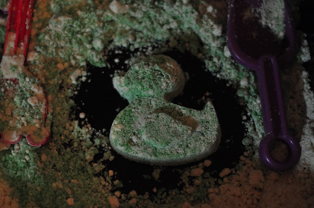 В песок можно добавить ещё пищевых красителей, чтобы было интереснее. Лучше использовать масляные. Если брать красители, которые разводятся в воде, то образуются комки. Но справедливости ради скажу, что если комки тщательно разделить на мелкие кусочки, то лепится такой песок ничуть не хуже, чем песок без красителя.