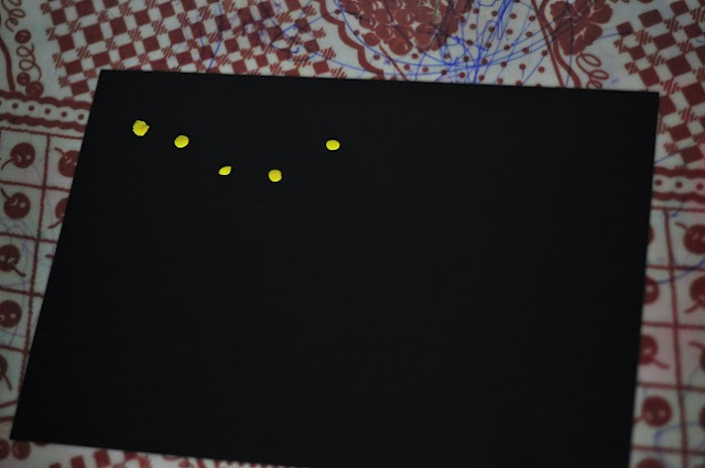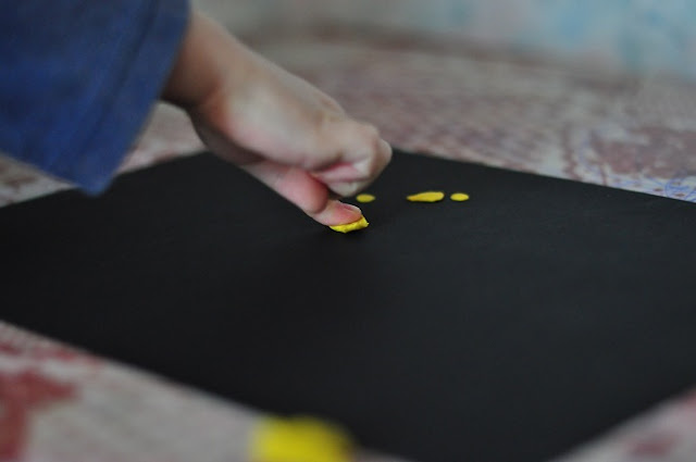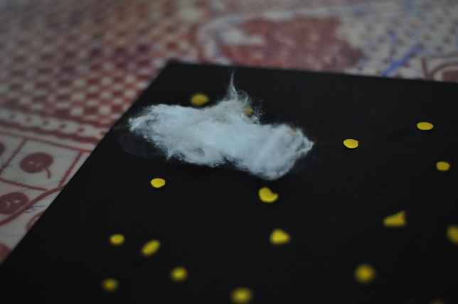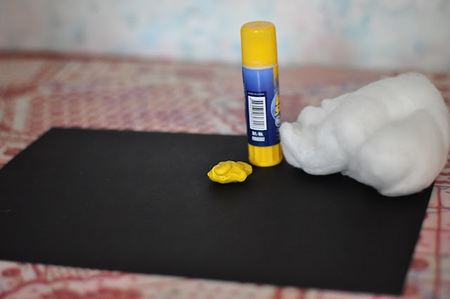 Понадобится: черная бумага, белый или желтый пластилин, клей и вата