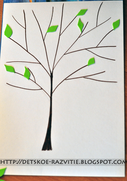 Почти все деревья в округе уже зеленые, многие вовсю цветут. Вот и мы решили сделать весеннее дерево с молодыми листиками.