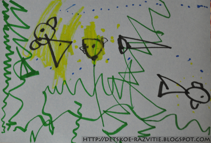 Вот такое может нарисовать двухлетний ребенок полностью самостоятельно. Как бы неровно это не было, все равно можно узнать рыбок. И гордо повесить рисунок на стену.