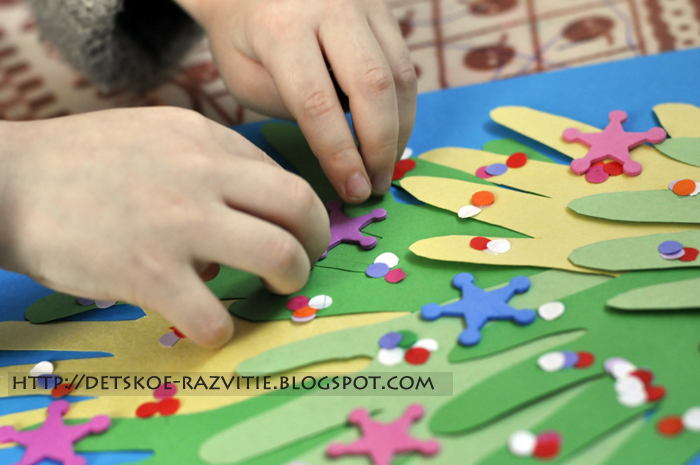Мы использовали дырокол и обрезки от прошлых аппликаций, чтобы наделать конфетти.