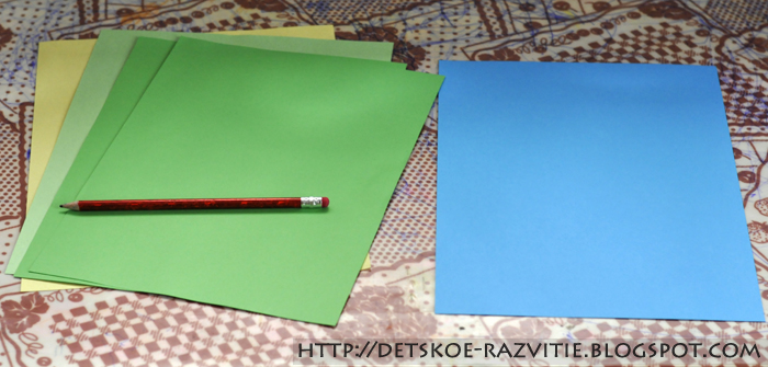 Цветную бумагу желательно выбрать слегка разных оттенков, чтобы ёлка казалась объемнее. Для фона я бы советовала взять лист цветного картона или плотной бумаги, чтобы поделка была прочнее.
