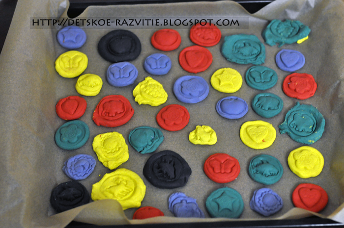 4. Дальше я выдала ребенку соленое тесто и все инструменты для лепки. А она уже сделала игрушки на ёлку. Мне осталось только проделать дырку в игрушках для веревочки и убрать всё в духовку.