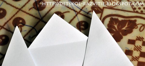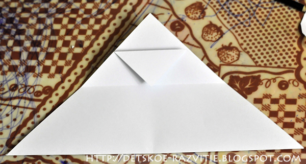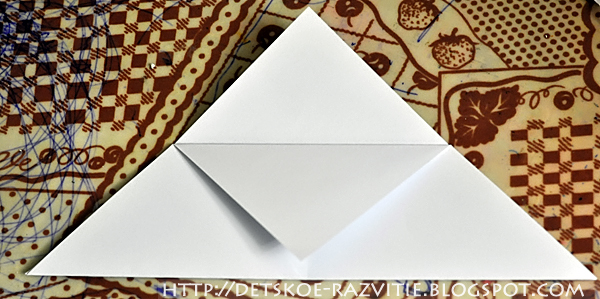 3. Отмечаем середину треугольника. На фото 2 шага можете увидеть внизу небольшую вмятинку. От этой серединки нужно загнуть края, как показано на следующем фото. Чтобы обязательно равнялось по верхней линии сгиба. Это сложно описать, но думаю по картинкам всё поймете.