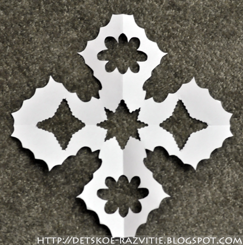 Сегодня покажу нашу снежинку с 4 лучами. Такая снежинка хороша тем, что бумагу надо складывать меньшее количество раз, соответственно, её легче резать, что важно, если резать снежинку собирается ребенок.