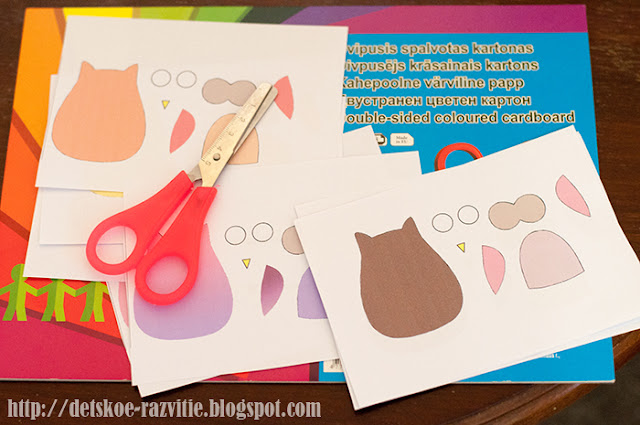 2. Цветной картон я разрезала на 4 части, это будут основы под открытку. Этот этап основной, но при этом самый простой - собираем и склеиваем сову.