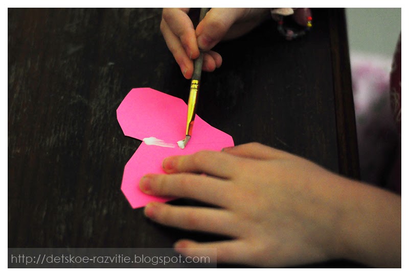 5. Намажьте клеем вырезанное сердечко, но не целиком, а только одну полоску посередине.