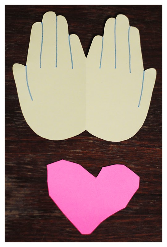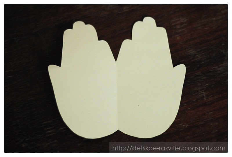 3. Прорисуйте линии пальцев, а на бумаге другого цвета нарисуйте сердечко и поручите ребенку его вырезать.